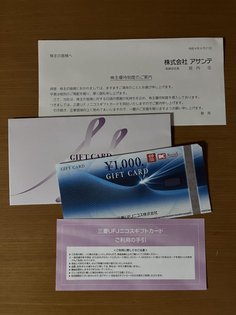 アサンテの株主優待は三菱UFJニコスギフトカードです。