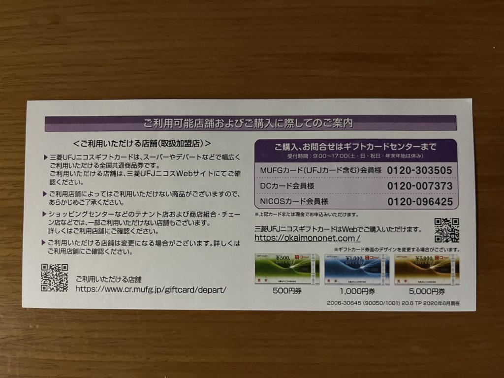 僕は100株保有なので1,000円相当の三菱UFJニコスギフトカードが貰えるということになります。