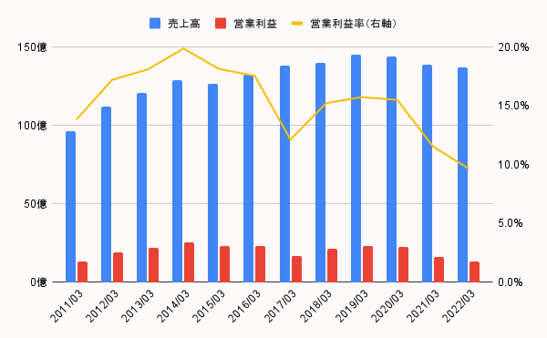 2022年5月10日発表の決算短信には、前期比で売上高が1.2%減、営業利益が17.3%減と書かれてました。次期は増収増益が見込めると書かれてました。
