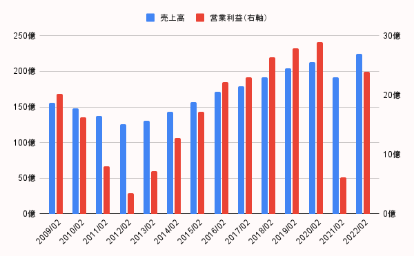 増収増益傾向だったのが2021年度でガクッと落ちてますね。コロナの影響でしょう。
